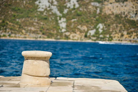 Metal bollard for boats and vessels on wharf over sea and sunset background close up. Maritime quayside with equipment for yatching at coastline. Travel season.