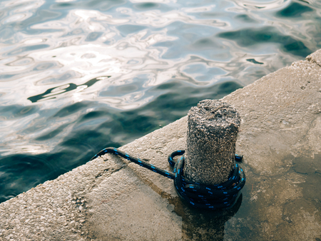 Knecht mount on a marina with a blue rope tied. Top view, close up