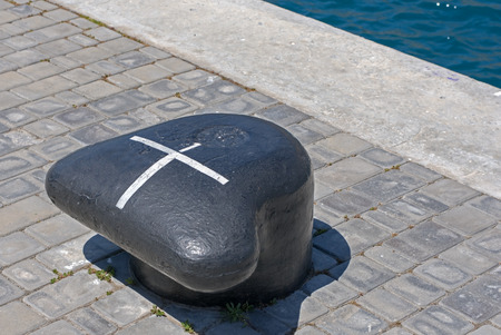 black bollard with knotted rope by the sea, photographed in a Spanish harbor