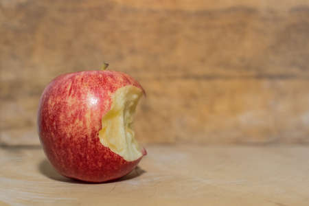 bitten off a little red apple on an old worn wooden background