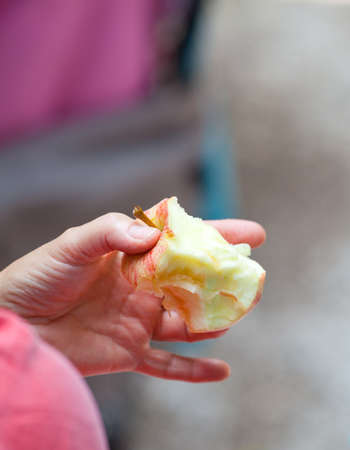 Tasty juicy eaten red apple in girls hand closeup, nature sunset golden hour background