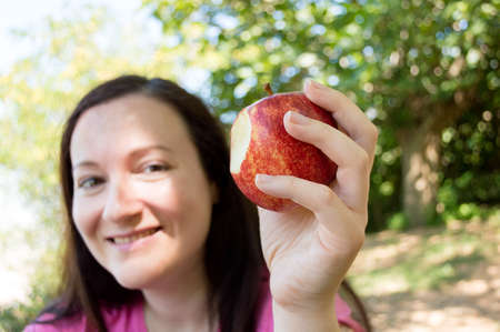 woman holding a bitten apple in front of her. high quality photo