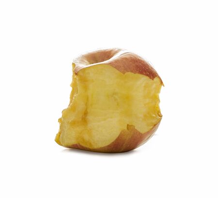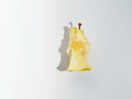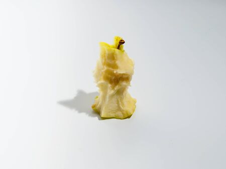 Isolated apple core on white background. Yellow organic apple core with copyspace for text.
