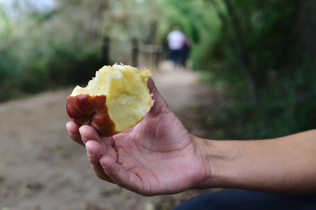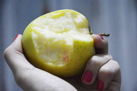 Apple is bitten in the hand.