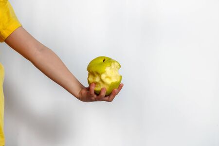 Green bitten apple in child hand on white