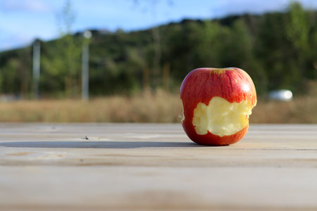 a bitten red apple on a wooden table, copy space and place for text