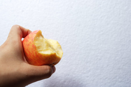 A close up of a hand holding a bitten apple against a clean white background. Fresh fruit, healthy eating, and natural lifestyle concept with copy space