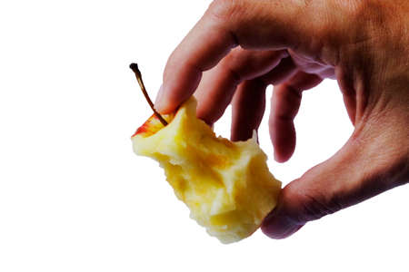 Man's hand holding an apple core with clipping path isolated on white background