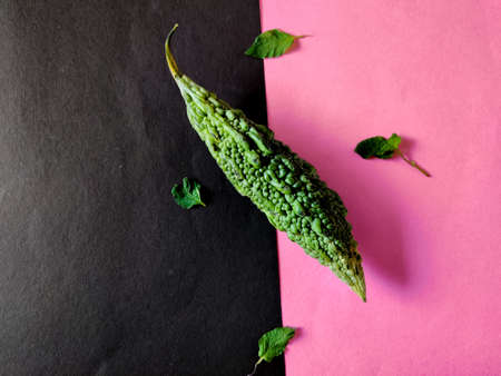 Fresh small size Bitter Gourd or Bitter Melon surrounded with mint leaves. Isolated on pink and black background.