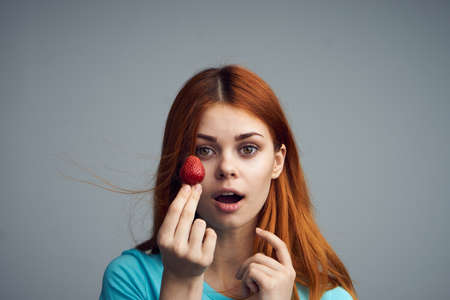Strawberry, summer, season, sweets, sweet strawberry, girl on a gray background.