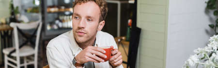curly man holding cup of cappuccino and looking away in cafe, banner