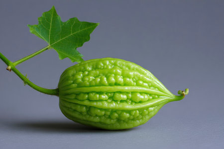 Green bitter gourd with leaf on grey background, closeup