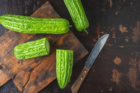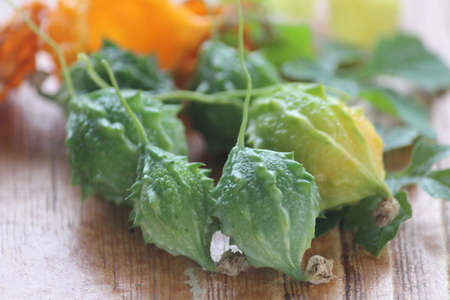 Small bitter gourd or bitter melon on wooden background, Food ingredients and herbal medicine