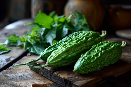close-up of bitter gourd on a board, created with generative ai