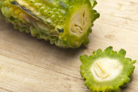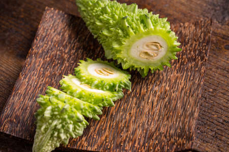 Bitter melon and sliced on wood background