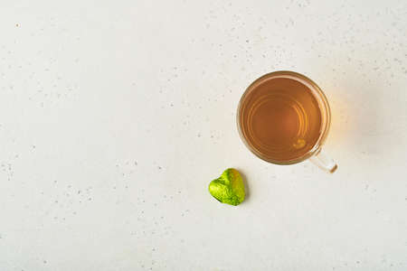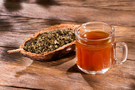 Camellia sinensis - Cup of green tea with dried leaves
