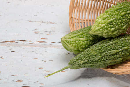 Bitter gourd or bitter melon in basket on wooden background. Scientific name is Momordica charantia. As a whole food and herbs for treating diseases.