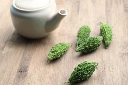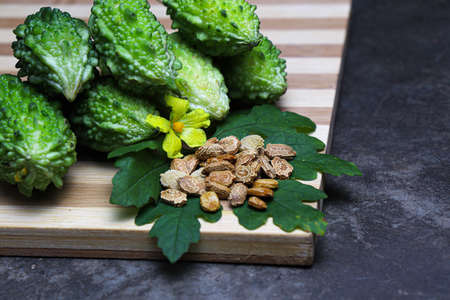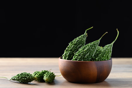 Bitter gourd or bitter melon in wooden bowl, Asian food ingredients and herbal medicine
