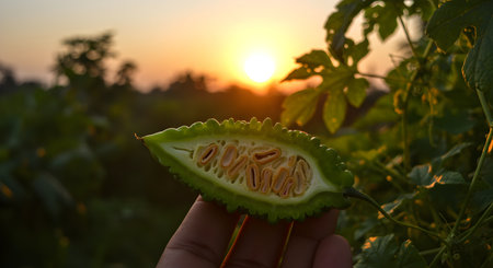 Bitter melon on hand with sunset background. (Momordica charantia)