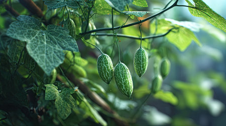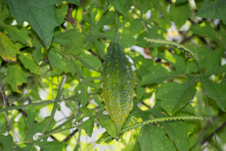 Bitter gourd also known by name momordica charantia freshly growing in the plant in its ripening stage with natural leaf background of the vines