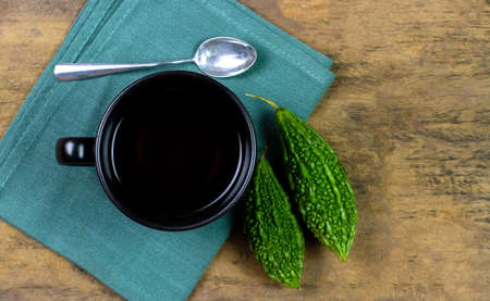 Bitter gourd or bitter melon tea in ceramic cup on rustic wooden background, top view.