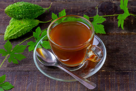 Bitter gourd or bitter melon tea in transparent cup and fresh bitter gourd with green leaf on rustic wooden table. Scientific name is Momordica charantia.