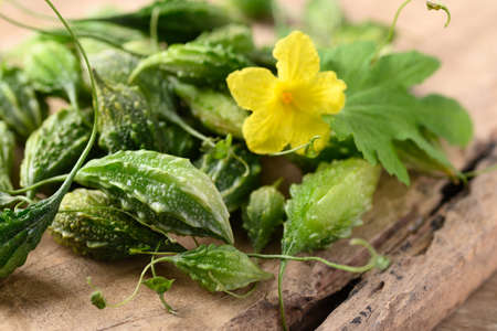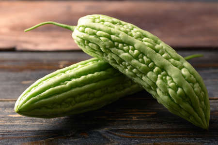 Close up fresh bitter gourd or bitter melon organic vegetables on wooden background