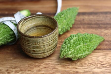Bitter gourd or bitter melon tea in ceramic cup with fresh bitter gourd and green leaf on rustic wooden table. Scientific name is Momordica charantia.