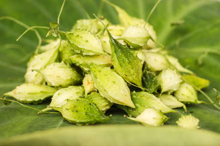 Ripe and unripe fruits, seeds and leaves of melon de são caetano.From the Momordica family, in the photo the species Momordica charantia