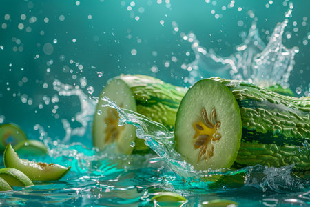 Fresh Cucumber Slices Splashing in Crisp Water with Dynamic Droplets on a Vibrant Teal Background - Healthy Food Concept AI Generative