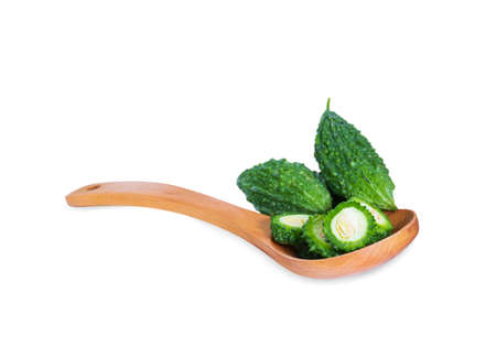 Bitter gourd pile with piece in Wooden spoon on white background. vegetable herb Nourish the health body