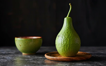 Fresh calabash in a wooden bowl and green bowl on dark background