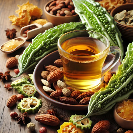 Green tea with bitter gourd and nuts on wooden background.
