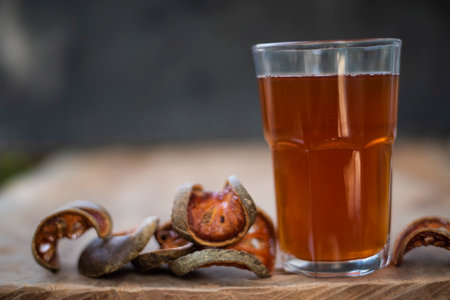 Brown bael fruit Juice in glass.Herb soft drink concetp.
