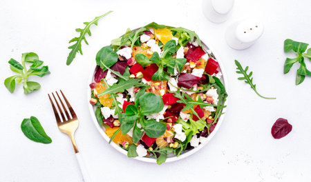 Beet, cheese and orange healthy salad with arugula, lamb lettuce, mini chard and pistachios, white kitchen table, copy space.. Fresh useful dish for healthy eating