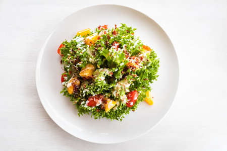 Fresh vegetable salad on white plate. Healthy food concept.