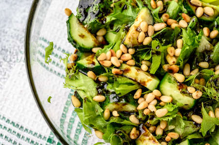 Healthy food concept: green salad with cucumbers, mint, pine nuts and balsamic. Selective focus. Organic food concept. Copy space