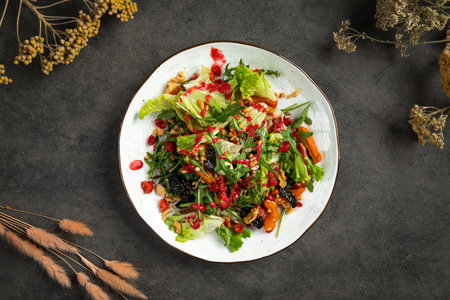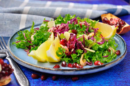 Salad of fresh vegetables, goat cheese and pomegranate seeds. Studio Photo