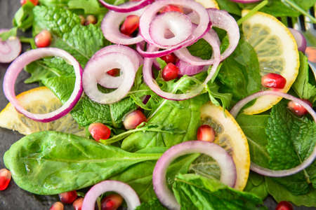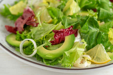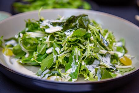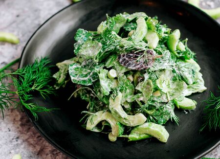 Close up shot of healthy green salad. Vegetarian food.