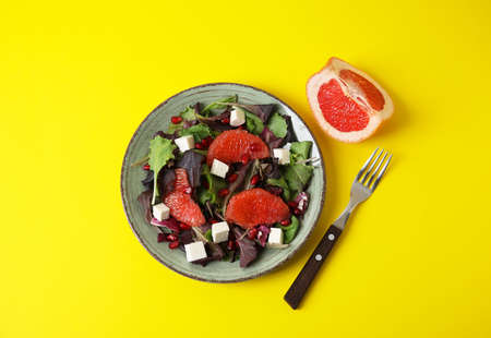 Plate with tasty grapefruit salad on color background