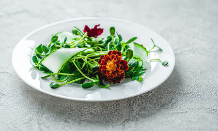 This vibrant and fresh salad features a mix of leafy greens, crisp radishes, and delicate flowers, elegantly presented on a light plate, perfect for healthy dining.