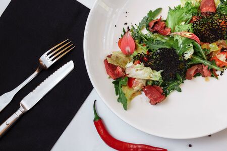 Tasty italian salad of beef tongue with eggs, arugula, tomato, spices and sauce.