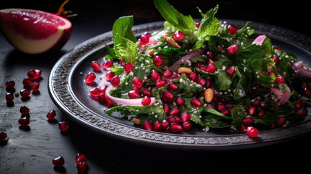 Tasty salad with pomegranate seeds, closeup