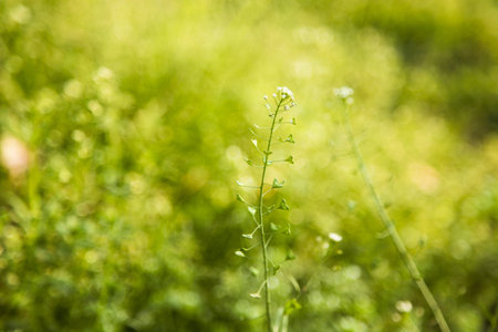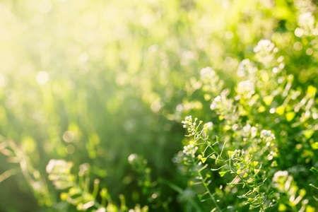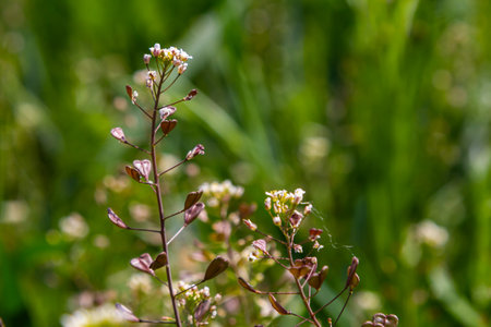 Close up of Capsella bursa-pastoris blooming in spring field. Summer Spring nature background.
