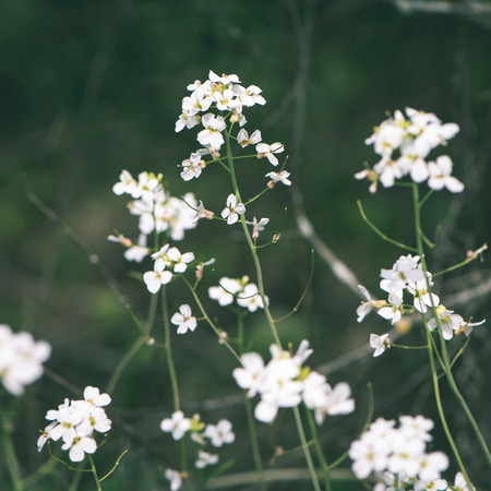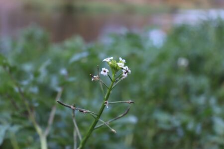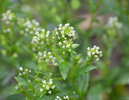 Shepherd's-purse or Capsella bursa-pastoris flowers close-up, selective focus, shallow DOF.