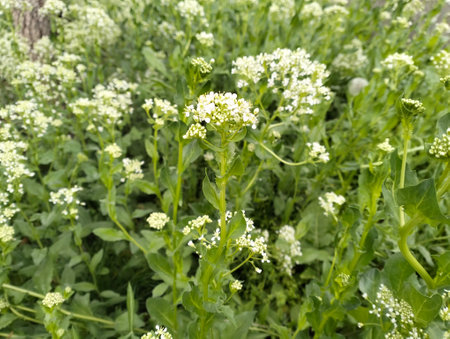 In a vibrant field field pennycress showcases its white blossoms and distinctive flat pods thriving amidst surrounding greenery in the early spring.