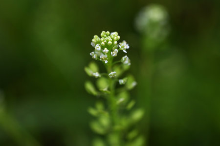Macro close up Green meadow with Capsella bursa pastoris, Flower of Shepherd's purse. natural background, Wild grass field Green white flower weed heart shape pods medicinal plant