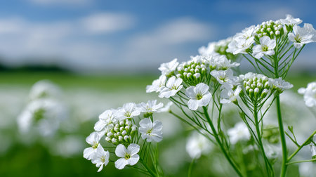 Delicate White Blooms in a Spring Meadow Under a Bright Sky, Capturing Nature s Serene Beauty