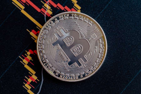 Gold crypto coin on the chart. Close-up photo of bitcoin.