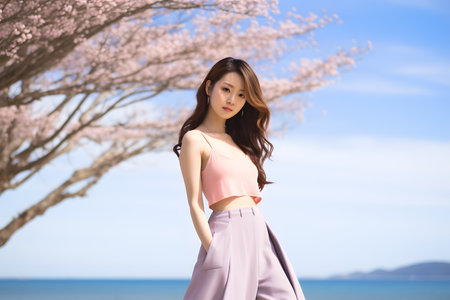 portrait of asian beautiful woman on the beach with sakura